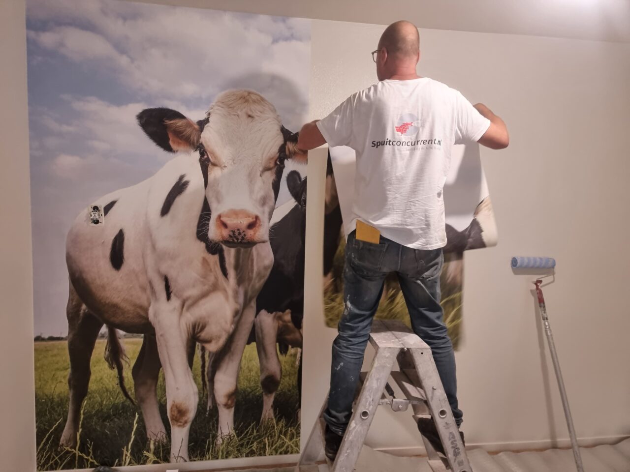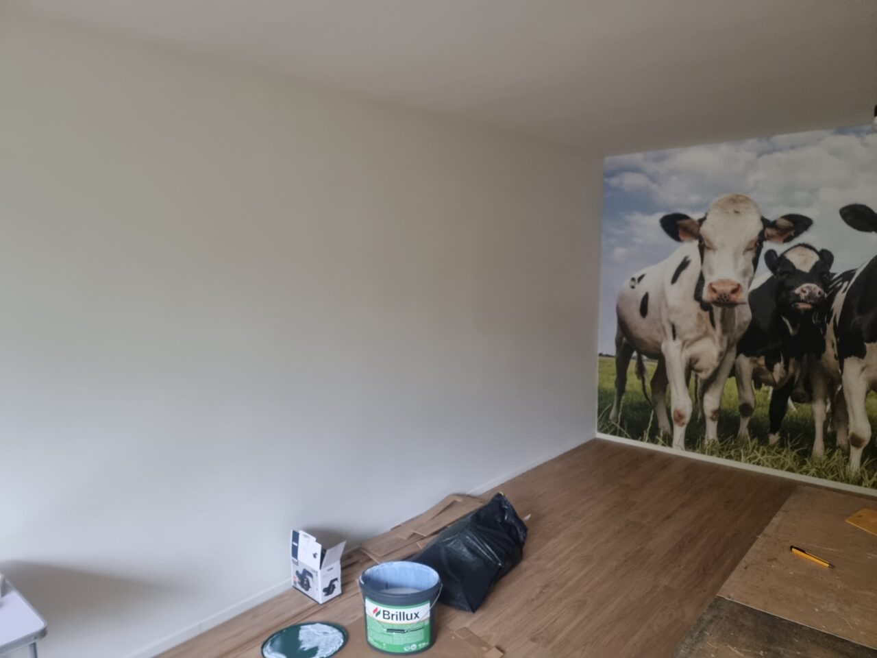 In deze nieuwbouwwoning hebben we alle wanden en plafonds voorzien van een frisse afwerking met latex. Eén muur mocht er uitspringen met een unieke koeienprint, voor een speels en opvallend accent.